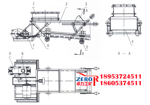 K型往復(fù)式給煤機由機架、底板(給煤槽)、傳動平臺、漏斗、閘門、托輥等組成。當電機開動后經(jīng)彈性聯(lián)軸器、減速機、曲柄連桿機構(gòu)拖動傾料5°的底板在輥上作直線往復(fù)運動,煤均勻地卸到其他設(shè)備上。