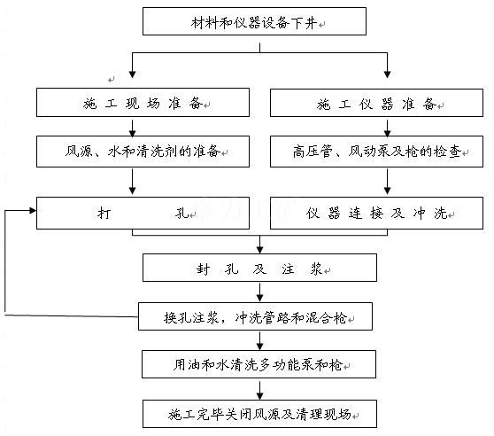 2、施工方案:用煤電鉆造孔、封孔器封孔,利用專用注漿泵注入馬麗散達到加固的目的。