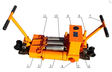 主要結構如圖:1前夾具體、2活塞桿、3油缸、4回油閥(另一側為備用回油閥)、5后夾具體、6斜鐵(6塊)、7扳把、8油泵搖桿、9油箱、10復位彈簧、11小安全銷(2個)。㈡工作原理:增大軌縫時,使用前夾具體1與后夾具體5,通過四個柱塞泵將液壓油壓入雙油缸中,活塞2向外伸出,前、后夾具體中的斜鐵夾住兩條鋼軌后,推動鋼軌使兩條鋼軌間的縫隙增大,從而達到調整軌縫的目的。四、使用方法和保養正確的使用與保養,對保證機具的正常工作和延長其使用壽命具有重要作用,操作者應認真閱讀本說明書,以了解各部結構和作用。㈠、使用前檢查1、油箱內油面高度是否達到油箱高度的2/3,夏季使用40#機油,冬季使用20#機油,加油時應過濾。2、操縱部分是否靈活可靠。3、回油閥啟閉是否正常,各液壓件工作是否正常。4、各連接緊固部位是否松動和有無漏油現象。㈡、操作步驟1、將機具置于被調整的兩根鋼軌接頭處,使軌縫位于前夾具體1與后夾具體5之間。2、向下搬動夾具體上的操縱扳把7使夾具體落在鋼軌上。3、順時針旋緊回油閥4,用操縱桿搖動油泵搖桿8,使液壓油輸入工作油缸3中,當活塞2伸長20mm后,斜鐵則可夾住鋼軌,繼續搖動操縱桿即能達到調整軌縫作業目的。4、每次軌縫調整完畢應按逆時針方向先旋開回油閥,然后向上搬動扳把7松開斜鐵,使工作油缸活塞在拉簧作用下復位,即完成一次工作循環。(本機設有兩個回油閥,當其中一個出故障時,打開另一個回油閥,即可使油缸復位,提高了本機的安全性能。)5、完成作業后,向上搬動各夾具體上的扳把7,通過棘爪將走行輪落在鋼軌面上,推行至下一軌縫處或整機下道。6、油箱內設有溢流閥,其壓力在出廠前已調整至52MPa,當負載過大時,溢流閥卸荷,從而保證機具使用安全。㈢故障排除