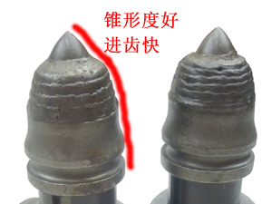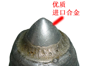 優(yōu)勢一: 齒尖采用進口合金, 其耐磨性是普通截齒的2~3倍 | 優(yōu)勢二: 齒尖鑲有超粗粒壓燒結(jié)硬質(zhì)合金鑲嵌, 合金直徑為22mm,超級耐磨 |
