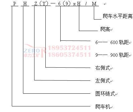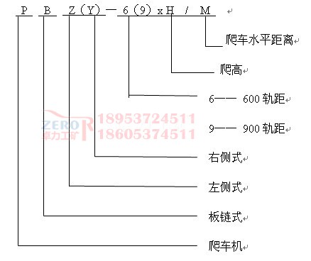 液壓鏈式爬車機用于600軌距1t、1.5t及900軌距1.5t、3t礦車向上爬高,根據爬高不同共有14種型號,每種又根據傳動裝置布置方式不同分為左側式與右側式。